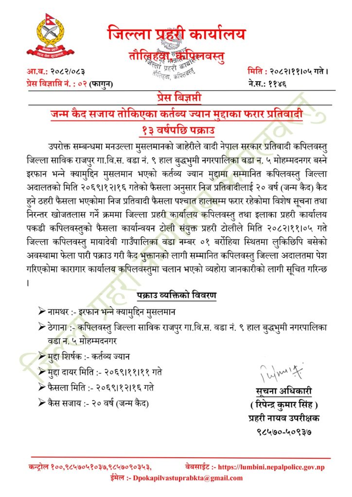 जिल्ला प्रहरी कार्यालय कपिलवस्तुका अनुसार मनउल्ला मुसलमानको जाहेरीले वादी नेपाल सरकार भएको कर्तव्य ज्यान मुद्दामा संलग्न प्रतिवादी इरफान भन्ने क्यामुद्दिन मुसलमानलाई पक्राउ गरिएको हो। उनी साविक राजपुर गाविस–९, हाल बुद्धभूमि नगरपालिका–५, मोहम्मदनगर निवासी हुन्।