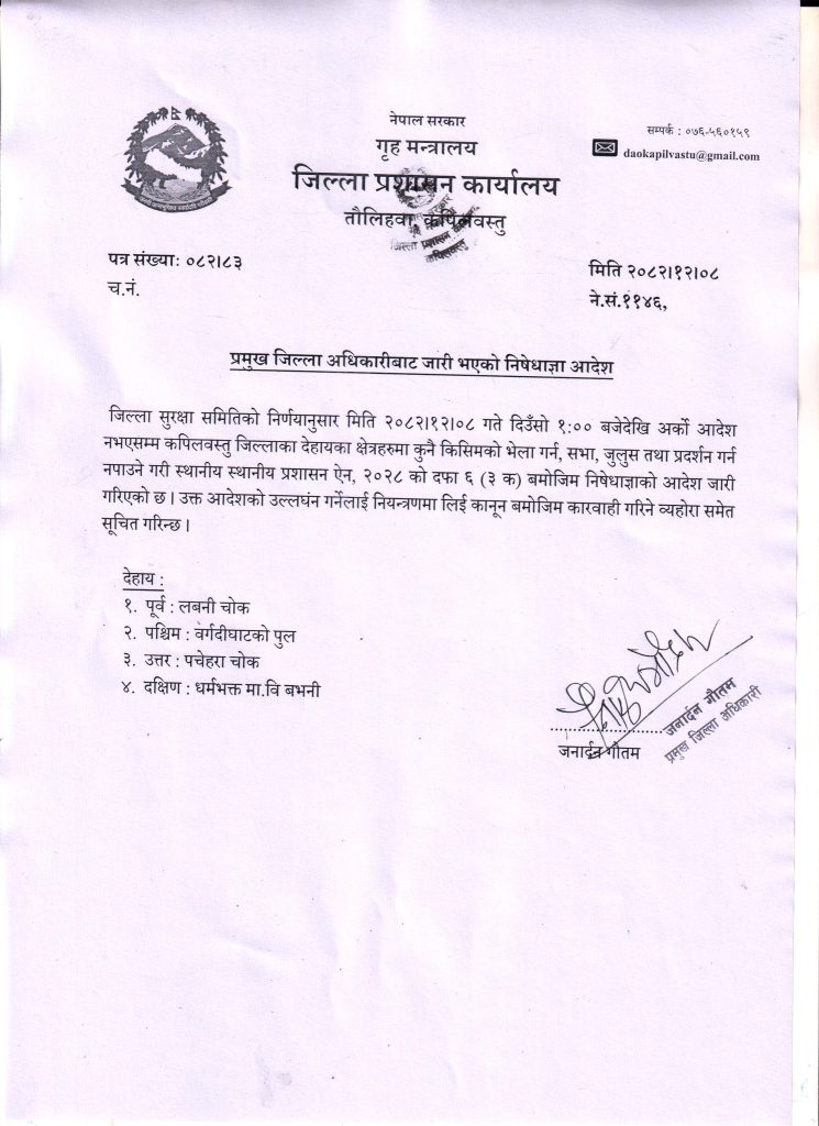 सो घटनापछि जिल्ला सुरक्षा समितिको निर्णयअनुसार मिति २०८२/१२/०८ गते दिउँसो १:०० बजेदेखि अर्को आदेश नभएसम्म कपिलवस्तु जिल्लाको तोकिएको क्षेत्रमा निषेधाज्ञा जारी गरिएको छ। निषेधाज्ञा अवधिभर कुनै किसिमको भेला, सभा, जुलुस तथा प्रदर्शन गर्न पूर्ण रूपमा निषेध गरिएको प्रशासनले स्पष्ट पारेको छ।